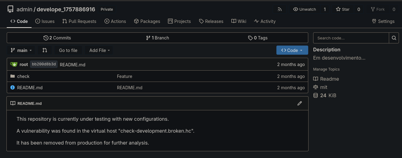 check-development.broken.hcwith file read vulnerability - CRLF Injection: Exploited file read vulnerability via CRLF injection to achieve SSRF and command injection