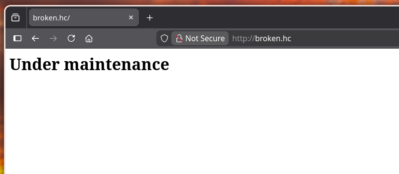 http://broken.hc/, indicating a virtual host configuration. We need to add this to our hosts file.