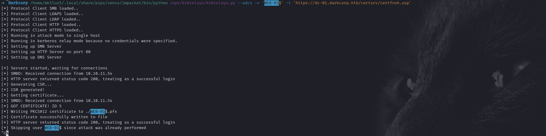 This writes a new KeyCredential to angela.w. It also exports a .pfx file we can use for PKINIT.