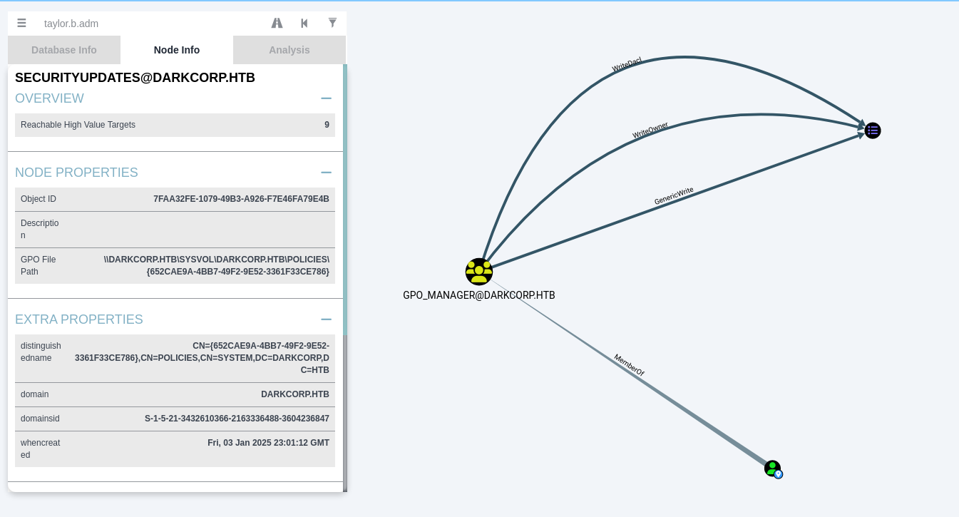 Armed with taylor.b.adm domain credentials, we can confirm membership or evaluate group policy objects (GPOs). Often, if taylor.b.adm is not already domain admin, it might have delegated rights to modify a GPO that runs on domain controllers or critical servers. Tools like pyGPOAbuse let us create scheduled tasks or commands via GPO modifications.