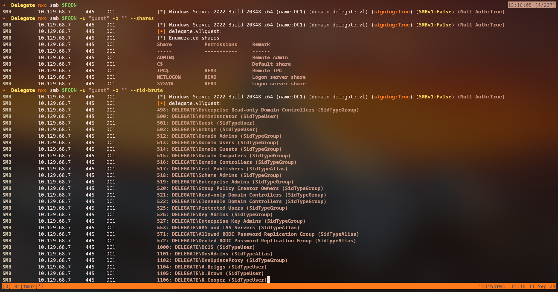 SMB 10.129.30.148 445 DC1 [*] Windows Server 2022 Build 20348 x64 (name:DC1) (domain:delegate.vl) (signing:True) (SMBv1:False) (Null Auth:True)