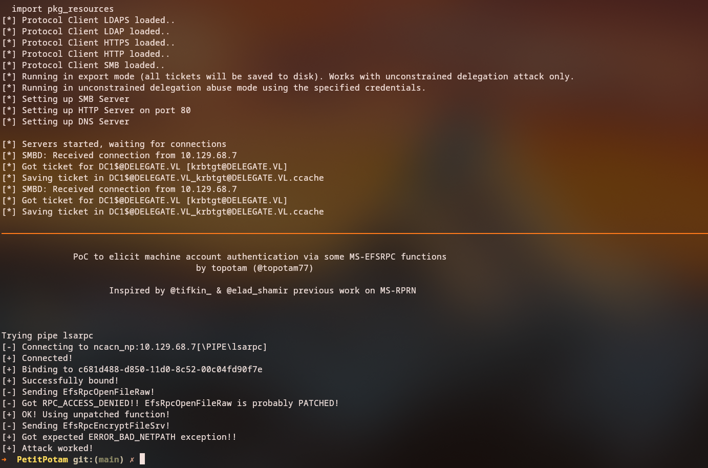 - Ticket Capture: Used PrinterBug/PetitPotam to force the DC to authenticate to our machine
