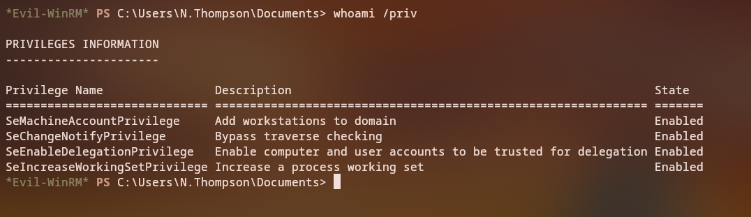 We can see that N.Thompson has the SeEnableDelegationPrivilege privilege, which allows setting delegation properties on other accounts.