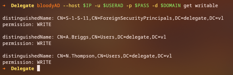 bloodyAD --host 10.129.30.148 -u A.Briggs -p P4ssw0rd1#123 -d delegate.vl get writable