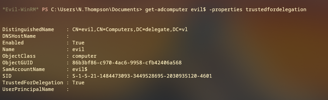 Get-ADComputer -Identity evil$ -Properties TrustedForDelegation