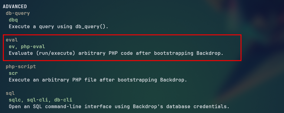Looking at the help, we see it is trying to use the --root flag at our current working directory, which is not a valid Backdrop CMS root directory. So we can use the --root flag to specify the root directory of the Backdrop CMS, which is /var/www/html, or run the command from that directory, granting us root command execution.
