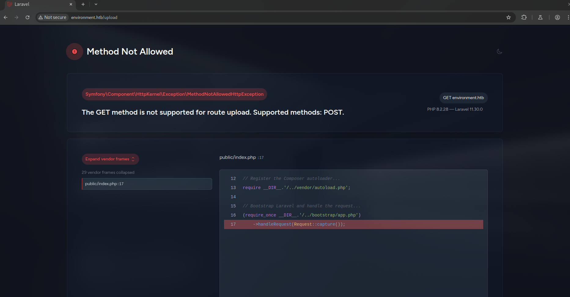 The enumeration reveals an upload page, by accessing the page we can read an interesting error message that indicates that Laravel debug mode is enabled.
