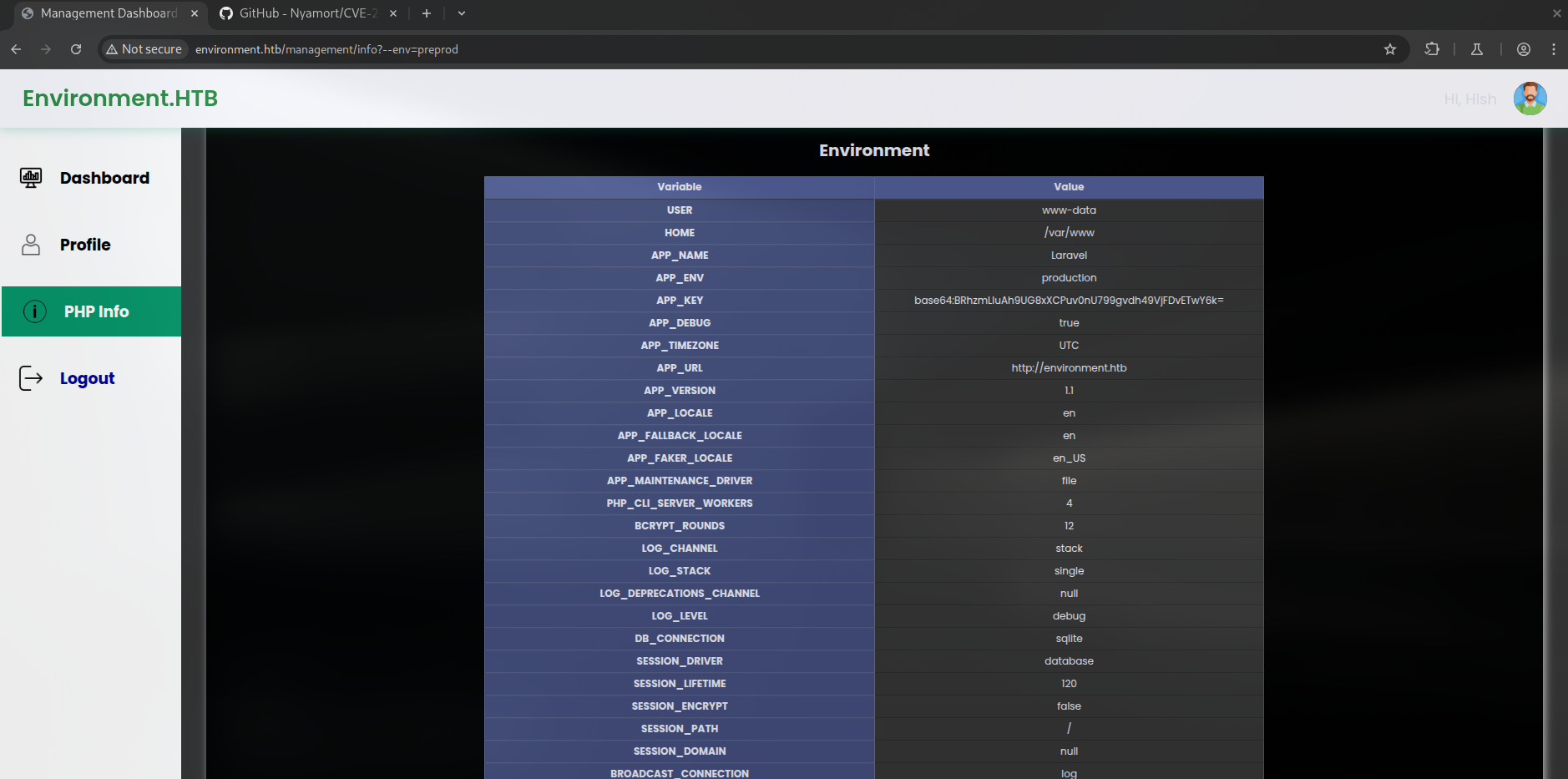 Researching this Laravel version for vulnerabilities, we discover CVE-2024-52301, which allows environment manipulation by appending ?--env=environment to URLs.
