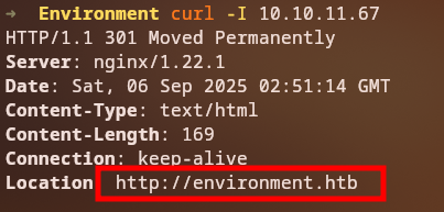 When we attempt to access the web service, we’re redirected to environment.htb. We need to add this to our /etc/hosts file: