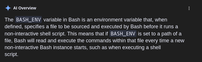 When bash is started non-interactively, to run a shell script, for example, it looks for the variable BASH_ENV in the environment, expands its value if it appears there, and uses the expanded value as the name of a file to read and execute.