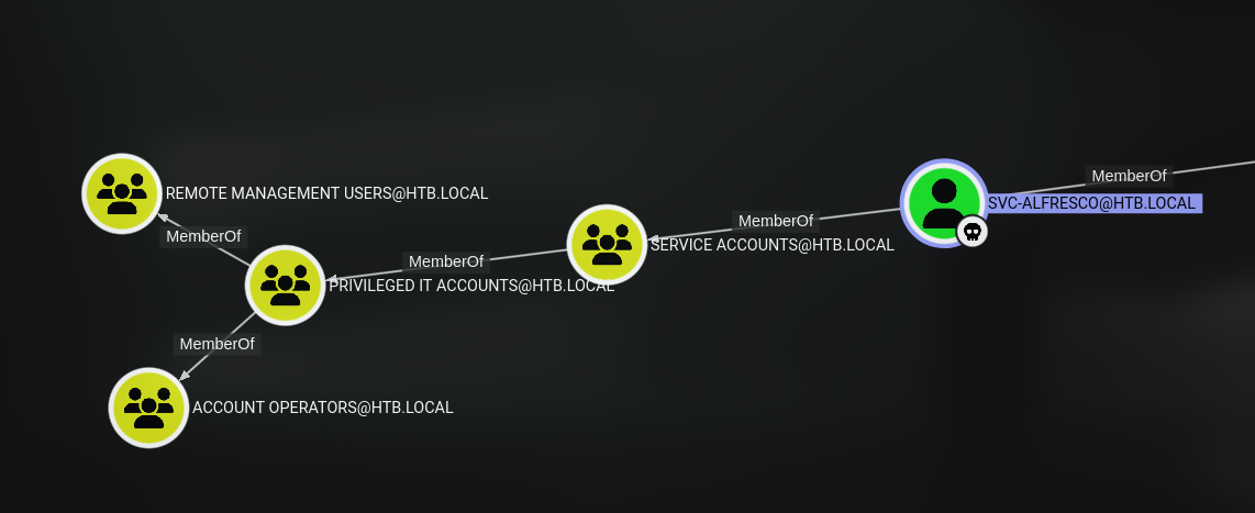 svc-alfresco, which has Kerberos pre-authentication disabled, making it vulnerable to AS-REP Roasting. - The machine has a group, “EXCHANGE WINDOWS PERMISSIONS”, which has the