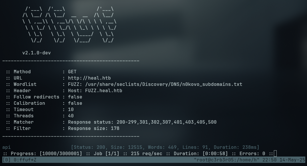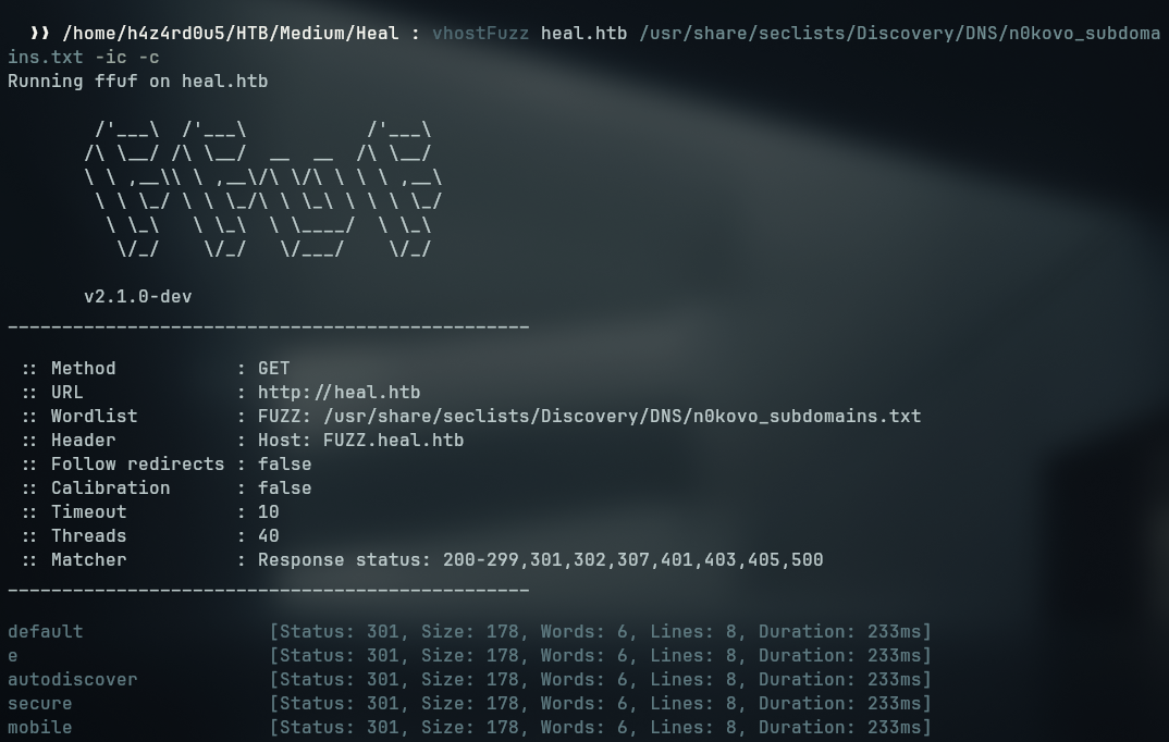 ffuf -u http://heal.htb -H 'Host: FUZZ.heal.htb' -w /usr/share/seclists/Discovery/DNS/n0kovo_subdomains.txt -ic -c -fs 178