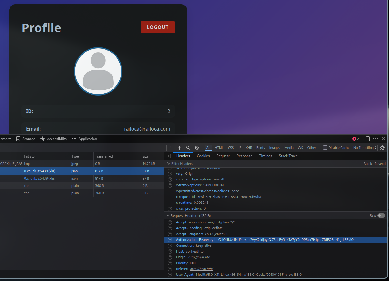 Analyzing the requests our browser makes after we login on the heal.htb application, we can see it is sending an authorization header in the request
