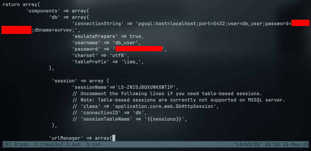 At config.php file at /var/www/limesurvey/application/config, we found some more credentials