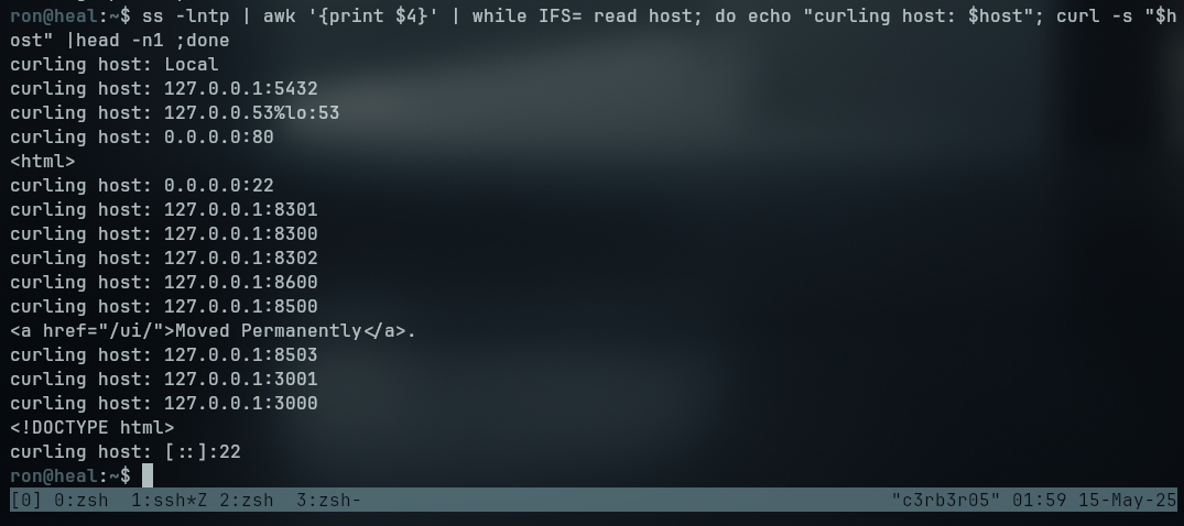 ss -lntp | awk '{print $4}' | while IFS= read host; do echo "curling host: $host"; curl -s "$host" |head -n1 ;done