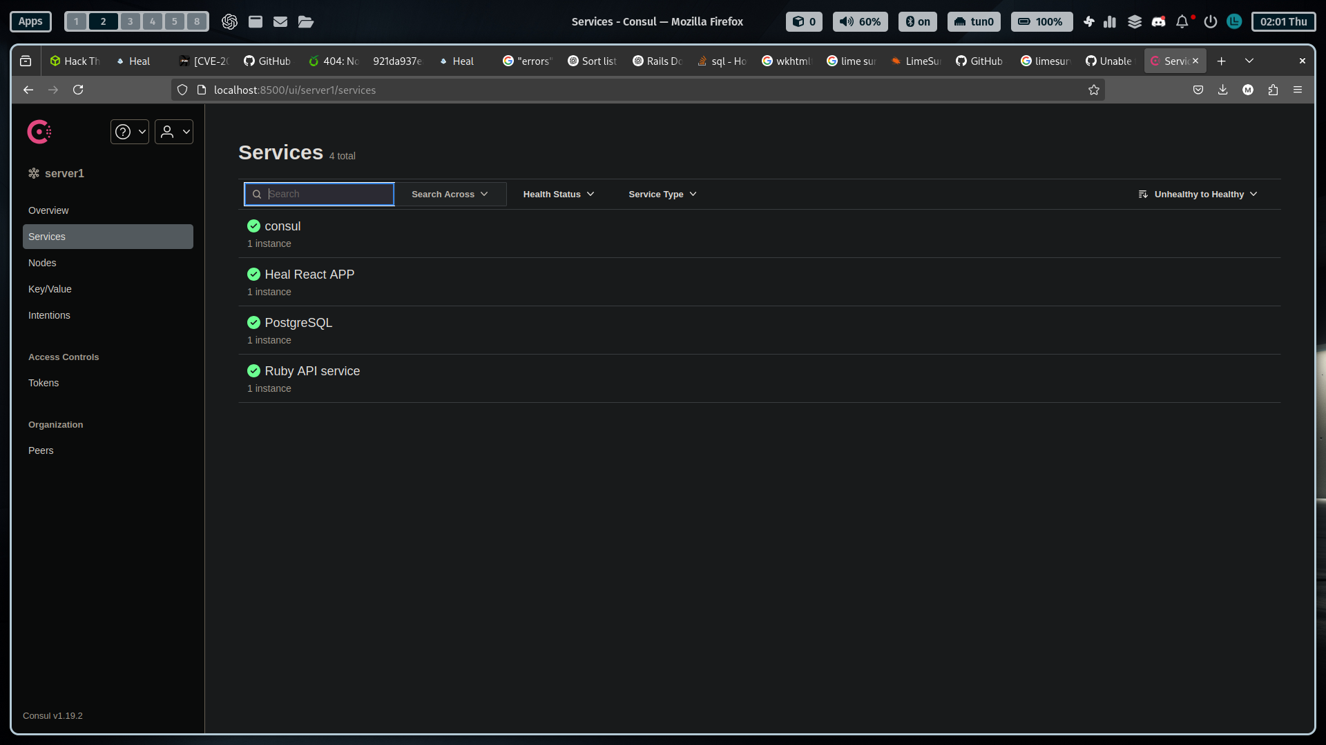 Accessing the forwarded port, we can see that we have now access to a consul v1.19.2 dashboard