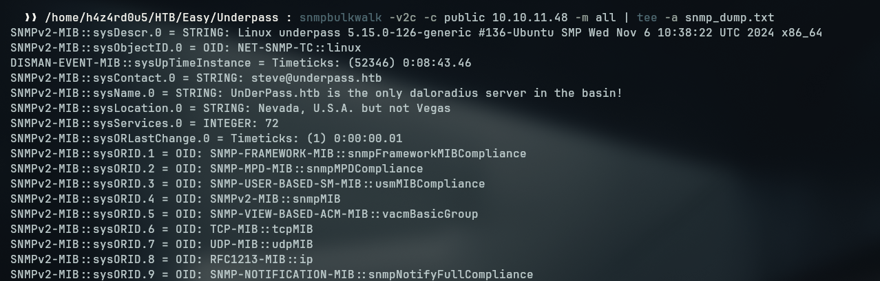 snmpbulkwalk -v2c -c public 10.10.11.48 -m all | tee -a snmp_dump.txt