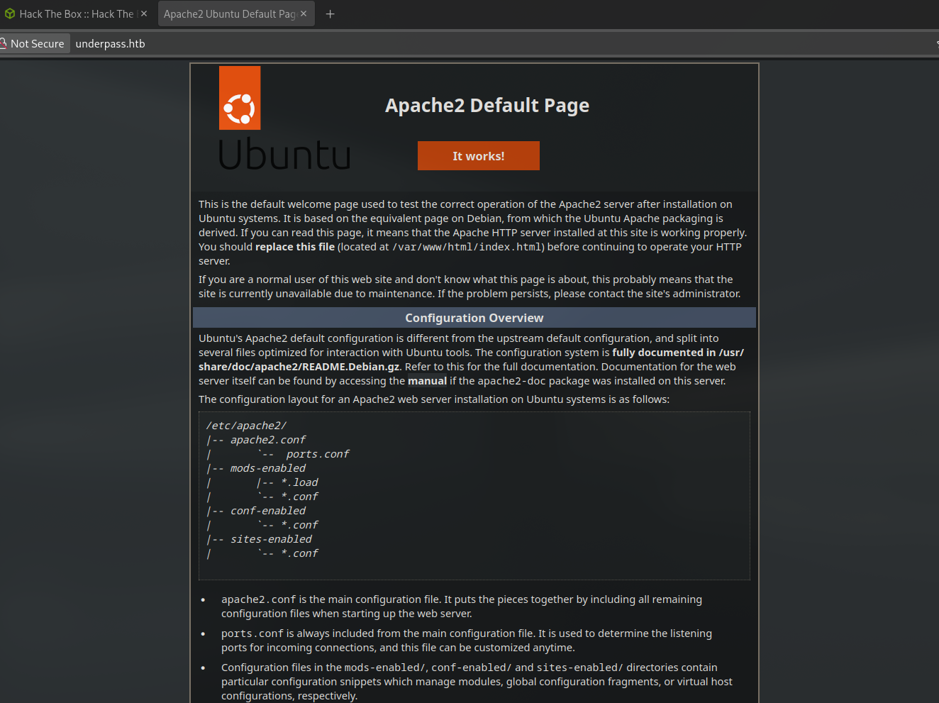 Enumerating the web server on port 80, we find a default Apache page, not much more than that. Without any other information, we tried enumerating the UDP ports.