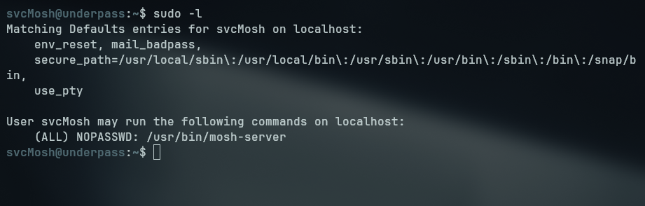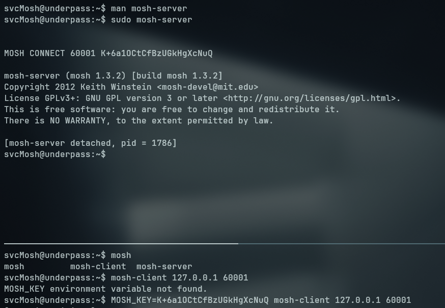 svcMosh@underpass:~$ mosh-client 127.0.0.1 60001