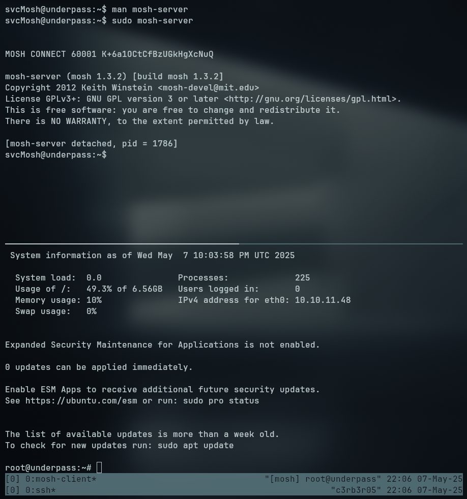 svcMosh@underpass:~$ MOSH_KEY=tdxgPzLRJM1JL/fSTnS71Q mosh-client 127.0.0.1 60001