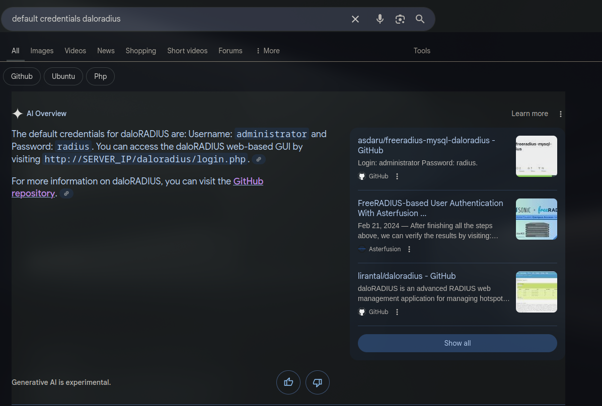 Looking for daloradius on google, we can find the source repository at github-daloradius, where we can find all the files and directories for the service.